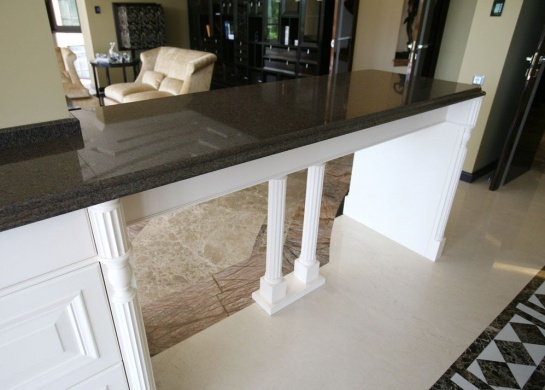 Столешница крепится к верхним частям рабочих столов с помощью саморезов.На что, кроме кухни, можно использовать искусственный камень?Область применения искусственного камня очень и очень широка. Он разрабатывался для огромного количества вещей.Его используют для отделки декоративных элементов домов, облицовки каминов, внутренней и внешней отделки катеров, изготовления ванн, раковин, любой другой сантехники, элементов мебели, столешниц. Из искусственного камня можно выливать рельефы, статуи, вазы, кашпо и многое, многое другое.Жидкий гранит GraniStone разработан для бытовых поверхностей и используется именно в мебельной отрасли. Это столешницы любых размеров и форм, подоконники, необычные по форме, цвету и не боящиеся влаги, барные стойки, столы любой сложности и габаритов, а также единые со столешницей отбойники и стеновые панели.
